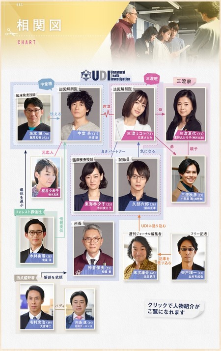 また口が悪い中堂系は法医解剖医で、中堂班の執刀医。アルバイトの久部六郎は実は週刊誌からのスパイで、UDIラボの記事を書くために送られてきた人物です。